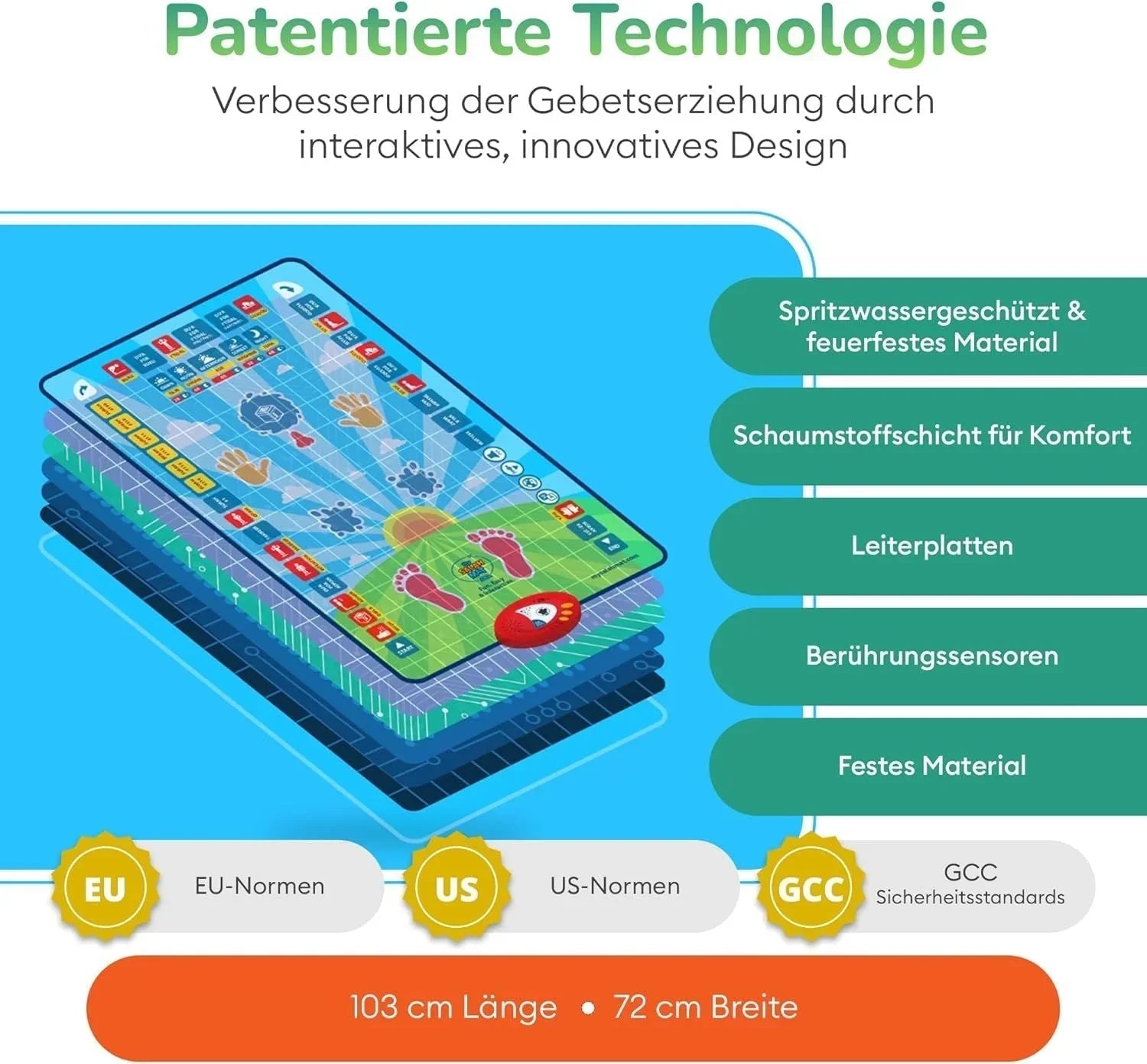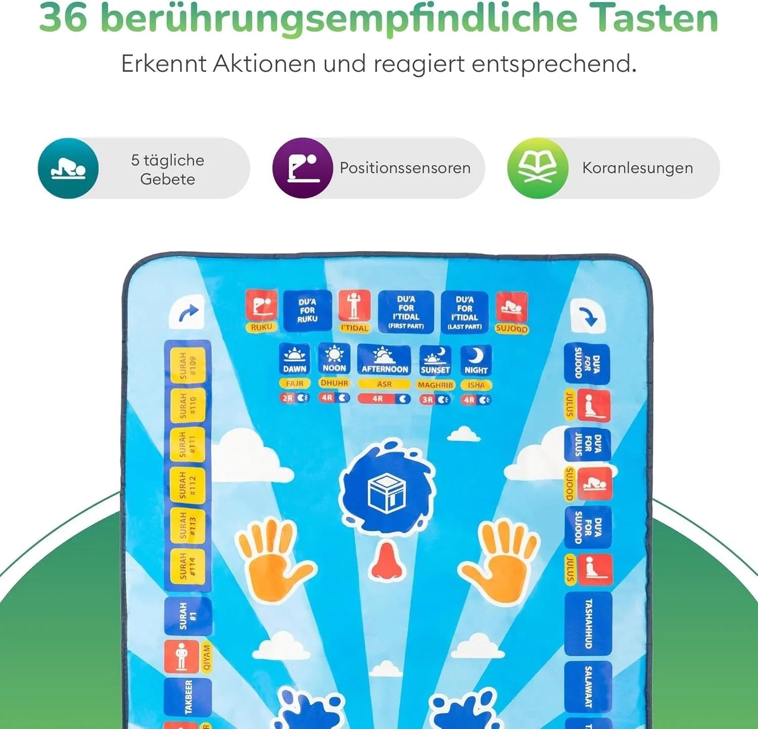 - The touch-sensitive prayer mats allow the user to recognize and respond to prayer positions. For example, when the user places their feet on the footrests on the prayer mat, the sensors in the My Prayer Mat recognize the pressure, and you will hear the first part of the Muslim prayer (Allahu Akbar), followed by Surah Al-Fatiha. Then when the knees, hands, and head touch the relevant spots on the mat, you will hear the sound of that part of the prayer.